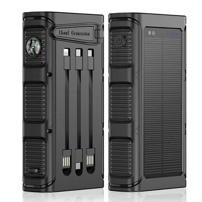 Solar-Powerbank mit Handkurbel, 30000mAh - tragbares Outdoor-Ladegerät mit PD-Schnellladefunktion (20 W), Taschenlampe, SOS-Alarm, Kompass und integrierten Kabeln
