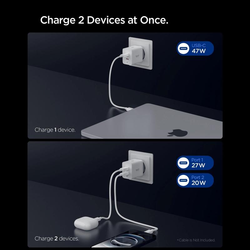 Das Spigen Essential EE472EU ist ein leistungsstarkes und kompaktes GaN Pro-Wandladegerät, das zwei Geräte gleichzeitig schnell auflädt und dabei ein sicheres, intelligentes Energiemanagement bietet. Es verfügt über zwei USB-C-Anschlüsse und passt die Leistung automatisch an, je nachdem, wie viele Geräte angeschlossen sind: Ein einzelnes Gerät kann die volle Leistung von 47 W über USB-C(1) beziehen, während zwei angeschlossene Geräte eine effiziente gemeinsame Leistung von 27 W + 20 W erhalten.