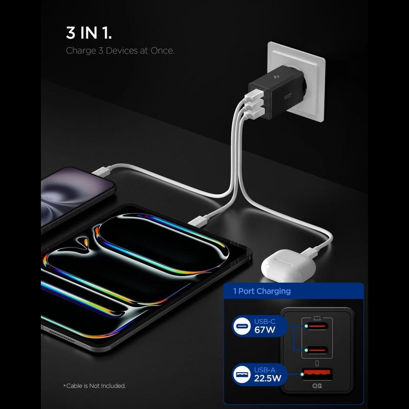 Das Spigen Essential EE673EU ist ein leistungsstarkes GaN Pro-Wandladegerät, mit dem bis zu drei Geräte gleichzeitig schnell aufgeladen werden können. Ausgestattet mit zwei USB-C-Anschlüssen (bis zu 67W) und einem USB-A-Anschluss (22,5 W) bietet es vielseitige und leistungsstarke Ladefunktionen für Smartphones, Tablets, Kopfhörer, tragbare Konsolen und anderes USB-betriebenes Zubehör - alles mit einem kompakten Adapter.