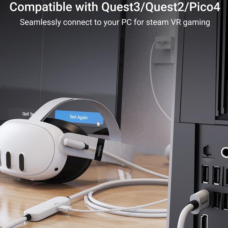 Wenn Sie Quest für PCVR verwenden, hilft dieses Kabel dabei, zwei häufige Probleme gleichzeitig zu lösen: Batterieverbrauch und Verbindungsstabilität. Sie erhalten eine USB 3.0-Kabelverbindung sowie einen dedizierten Ladeanschluss, sodass Sie während des Ladevorgangs weiterspielen können. Die Länge von 5m eignet sich für die aktive VR-Nutzung, und der Sicherheitschip sorgt für eine intelligentere Steuerung des Ladevorgangs und somit für eine bessere langfristige Pflege der Batterie.