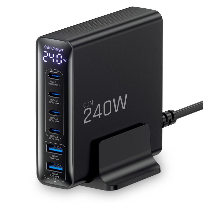 Tech-Protect DC240W-GaN 6-Port-Tischladegerät - PD-Schnellladegerät mit 240 W, 4 USB-C-Anschlüssen, 2 USB-A-Anschlüssen und LED-Anzeige