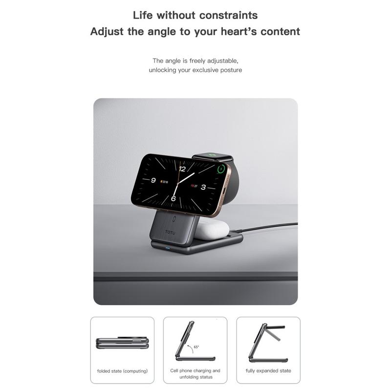 Die TOTU CW-4-W Wireless Charging Station ist eine elegante und vielseitige 3-in-1-Ladelösung für Ihr Smartphone, Ihre Smartwatch und Ihre Ohrhörer. Mit ihrem faltbaren magnetischen Design ist sie tragbar und platzsparend und somit perfekt für zu Hause und unterwegs. Die Ladestation besteht aus einer hochwertigen Aluminiumlegierung, PC und Nitrilgummi und kombiniert Langlebigkeit mit modernem Stil. Mit einer kabellosen Schnellladeleistung von bis zu 15W für Smartphones, 5 W für Ohrhörer und 2,5 W für Smartwatches sorgt sie dafür, dass alle Ihre wichtigen Geräte schnell und sicher mit Strom versorgt werden.