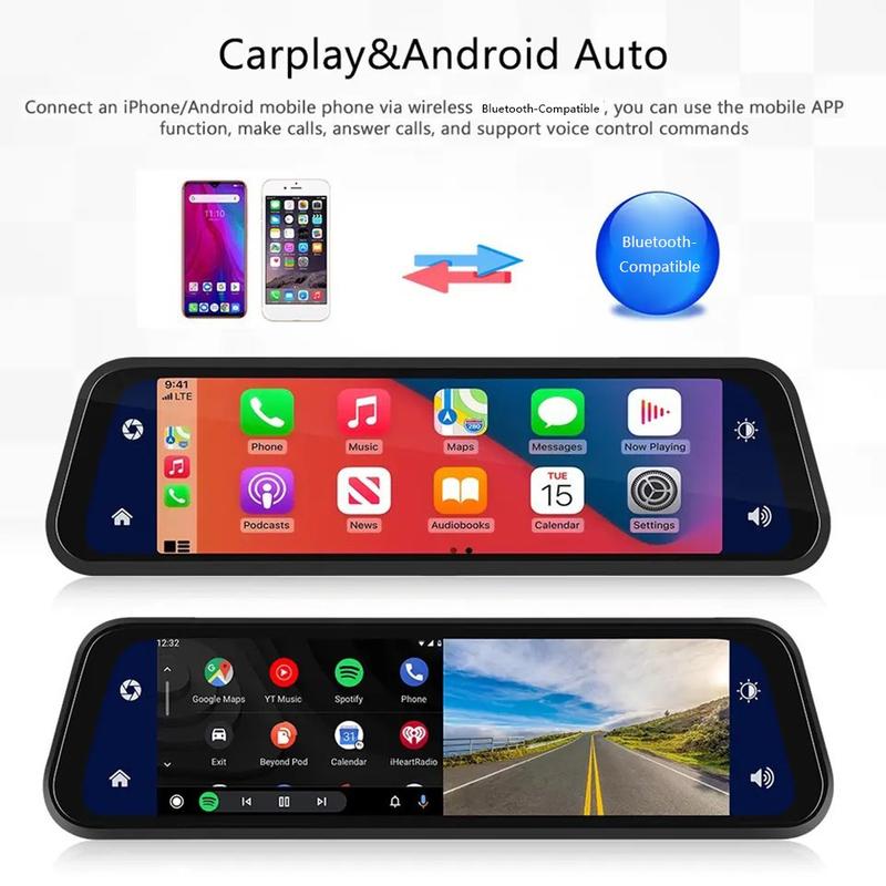 Mit drahtlosem CarPlay, drahtlosem Android Auto und kabelgebundenem Android Auto spiegelt die Dashcam die Navigations-, Musik- und Kommunikationsfunktionen Ihres Telefons direkt auf den großen Touchscreen. Die Siri-Sprachsteuerung ermöglicht eine freihändige Bedienung, sodass Sie Anrufe tätigen, Musik steuern oder Navigationsanweisungen befolgen können, ohne die Hände vom Lenkrad nehmen zu müssen.