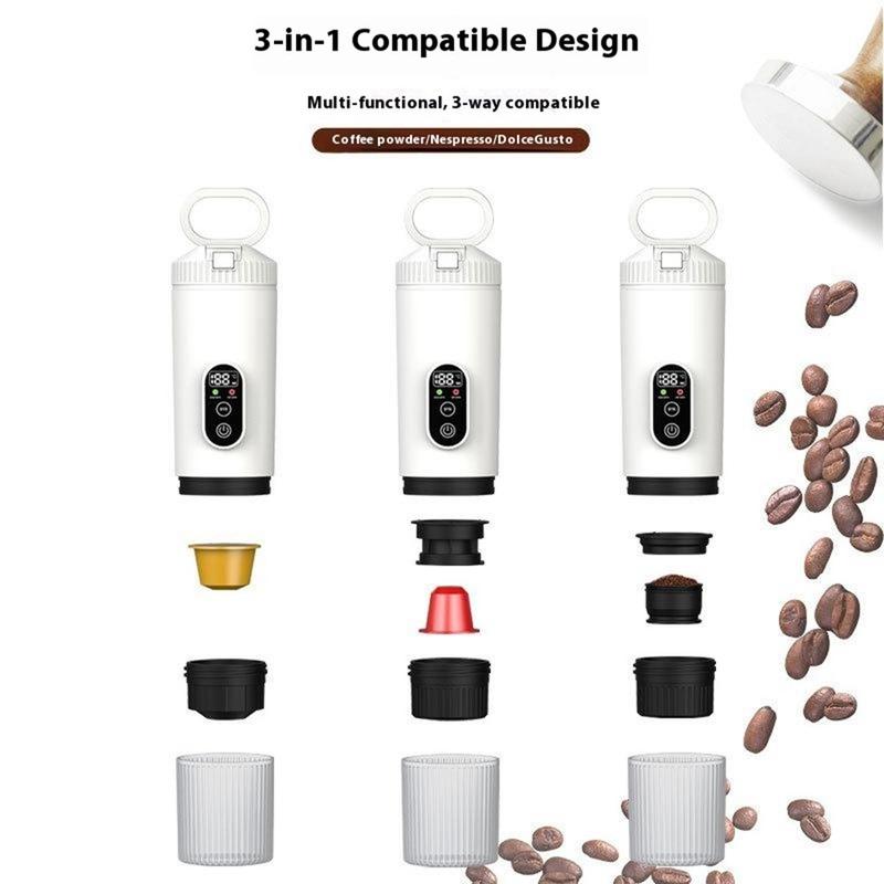 3-in-1 tragbare Espressomaschine - Kabellose elektrische Kapsel-Kaffeemaschine mit 7500mAh Akku für Auto, Haus & Outdoor - Kompatibel mit Nespresso, DolceGusto Kapseln, Kaffeepulver