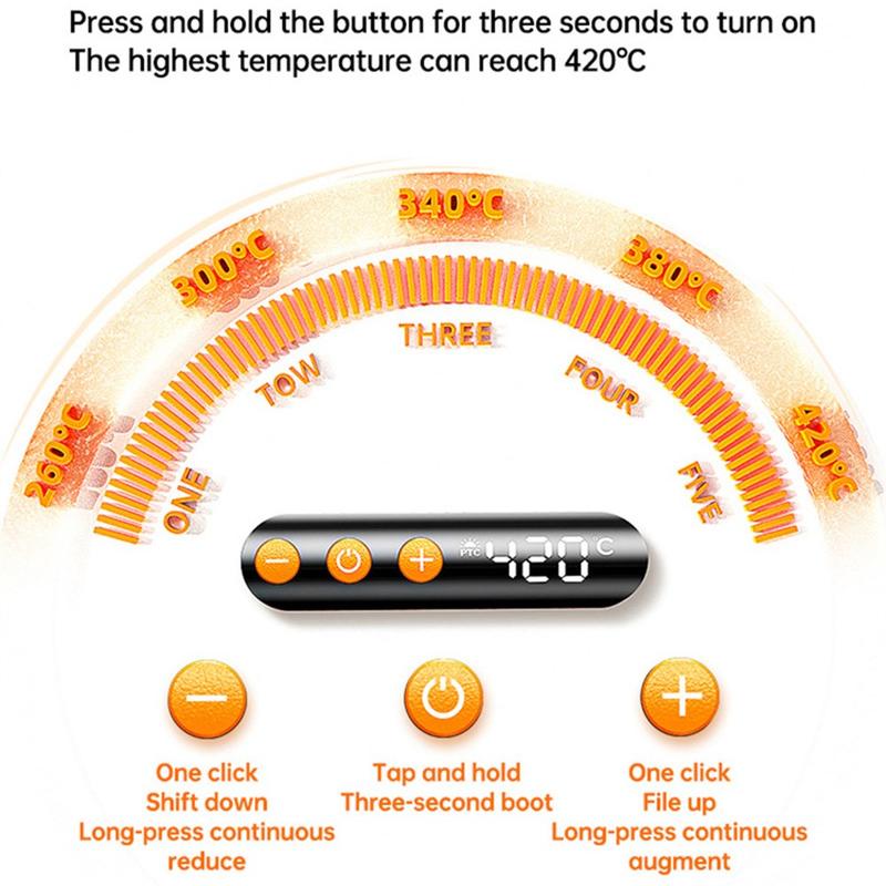 Ein digitales Display zeigt die Temperatur in Echtzeit an, während fünf einstellbare Heizstufen es Ihnen ermöglichen, die Temperatur an verschiedene Materialien und Aufgaben anzupassen. Das PTC-Keramik-Heizelement sorgt für eine schnelle Aufheizung des Lötkolbens und damit für einen schnelleren Start, und die integrierte LED-Arbeitsleuchte verbessert die Sichtbarkeit bei der Arbeit mit kleinen Bauteilen.