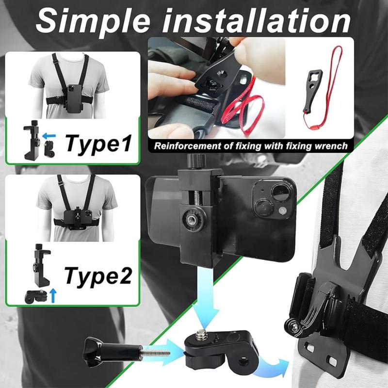 Eine praktische, stabile und vielseitige Brustgurt-Halterung, die sowohl für Handy- als auch für Actionkamera-Aufnahmen geeignet ist, mit verstellbarer Passform und flexiblen Blickwinkeln - ideal zum Radfahren, Wandern, Skifahren, Reisen und vielem mehr.