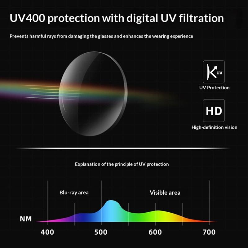 - UV400-beschichtete PC-Gläser blockieren UVA-/UVB-Strahlen und reduzieren Blendeffekte bei hellem Licht