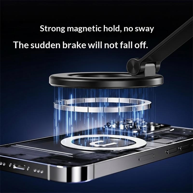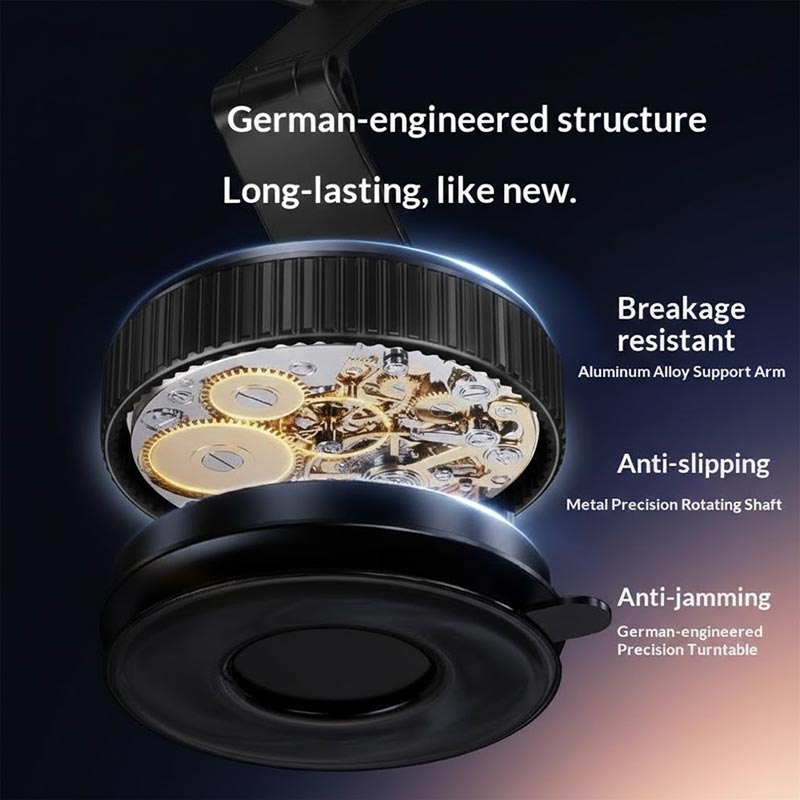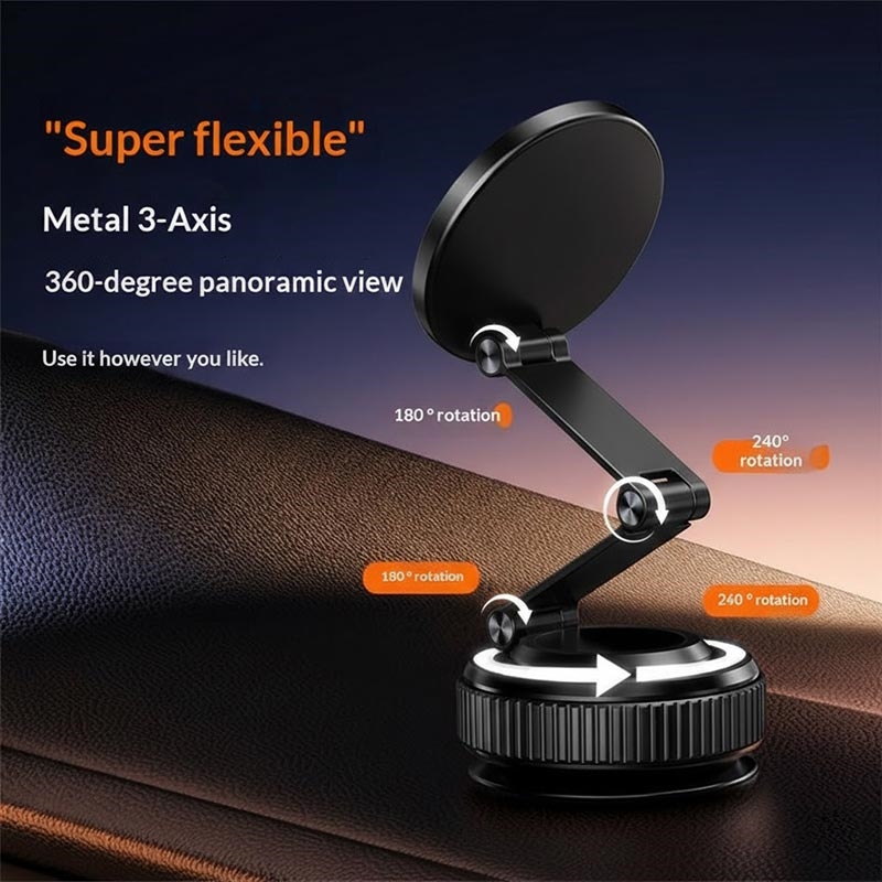 Die Halterung besteht aus einem dreifach klappbaren Arm aus Aluminiumlegierung und lässt sich flexibel über mehrere Achsen einstellen: 360°-Drehung der Basis, 240°-Bewegung des mittleren Gelenks, 180°-Einstellung der oberen Platte. Dies ermöglicht eine präzise Positionierung für Navigation, Anrufe oder Medienwiedergabe in jedem Winkel.