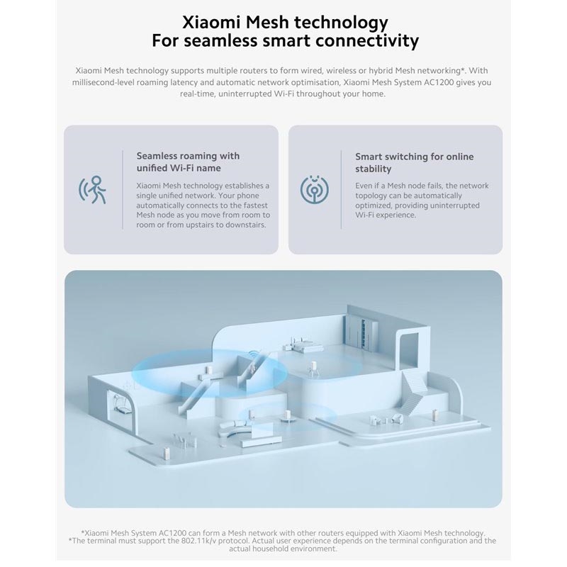 Das Xiaomi Mesh System AC1200 ist eine intelligente WLAN-Lösung für das ganze Haus, die für eine stabile, schnelle und nahtlose Internetabdeckung in Ihrem gesamten Zuhause entwickelt wurde. Mit Dualband-WLAN-Geschwindigkeiten von bis zu 1200 Mbit/s, vollständigen Gigabit-Ethernet-Anschlüssen und der Xiaomi Mesh-Technologie hilft es, Bereiche mit schwachem Signal zu beseitigen und sorgt für eine reibungslose Verbindung, wenn Sie sich von Raum zu Raum bewegen.