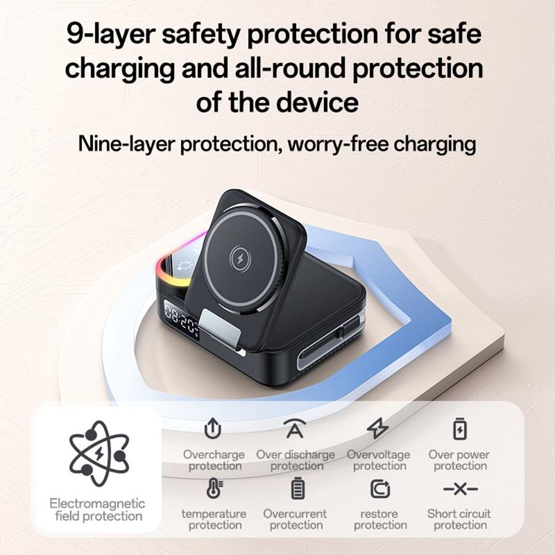 - 8-in-1-Multifunktionsdesign - Integriert kabellose Ladepads, USB-A- und USB-C-Schnellladeanschlüsse, eine LED-Digitaluhr und RGB-Umgebungsbeleuchtung für ein umfassendes Ladeerlebnis.