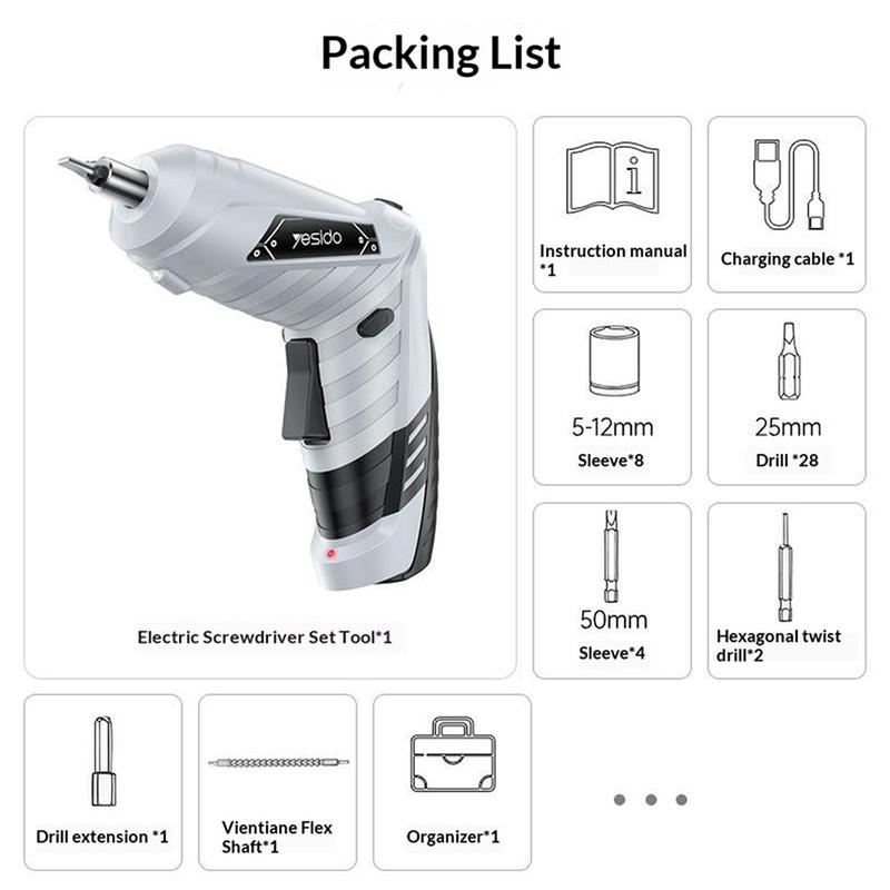 Yesido EC34 Akku-Schraubendreher-Set - Multifunktionales Reparaturwerkzeug in gerader und Pistolenform mit LED-Licht