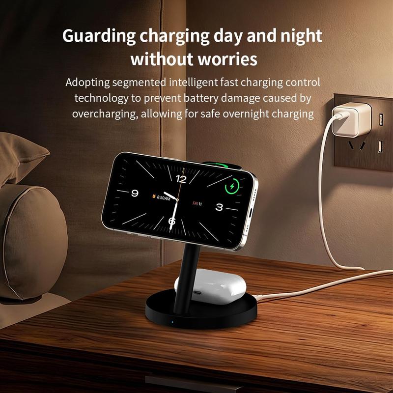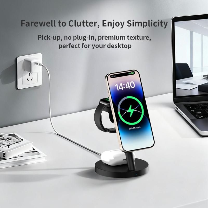 3-in-1-Wireless-Ladegeräte sind beliebt, weil sie Kabelsalat reduzieren und das tägliche Aufladen bequemer machen. Magnetische Ladeständer sind besonders nützlich, da sie das Smartphone leichter in die richtige Position bringen als ein flaches Ladepad. Modelle mit verstellbaren Halterungen erleichtern zudem das Überprüfen von Benachrichtigungen, die Nutzung des Standby-Modus oder das Sichtbarhalten des Bildschirms während des Ladevorgangs.